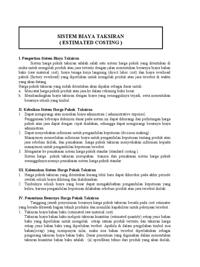 Penerapan dan perhitungan akuntansi dalam sistem biaya taksiran akan dipakai sebagai dasar untuk mencatat harga pokok produk atau jasa ke dalam rekening buku besar, selain itu sistem biaya taksiran juga digunakan untuk membandingkan biaya taksiran dengan. Harga pokok taksiran yang ditentukan kurang teliti baru dapat dikoreksi pada akhir periode setelah selisih biaya dihitung dan dialokasikan. Sistem biaya taksiran ( estimated costing ) i. Tujuannya adalah untuk pengendalian biaya. Bab ipendahuluan 1.1 latar belakangsistem biaya taksiran merupakan merupakan bagian dari pembelajaran cabang akuntansi yaitu akuntansi biaya.
